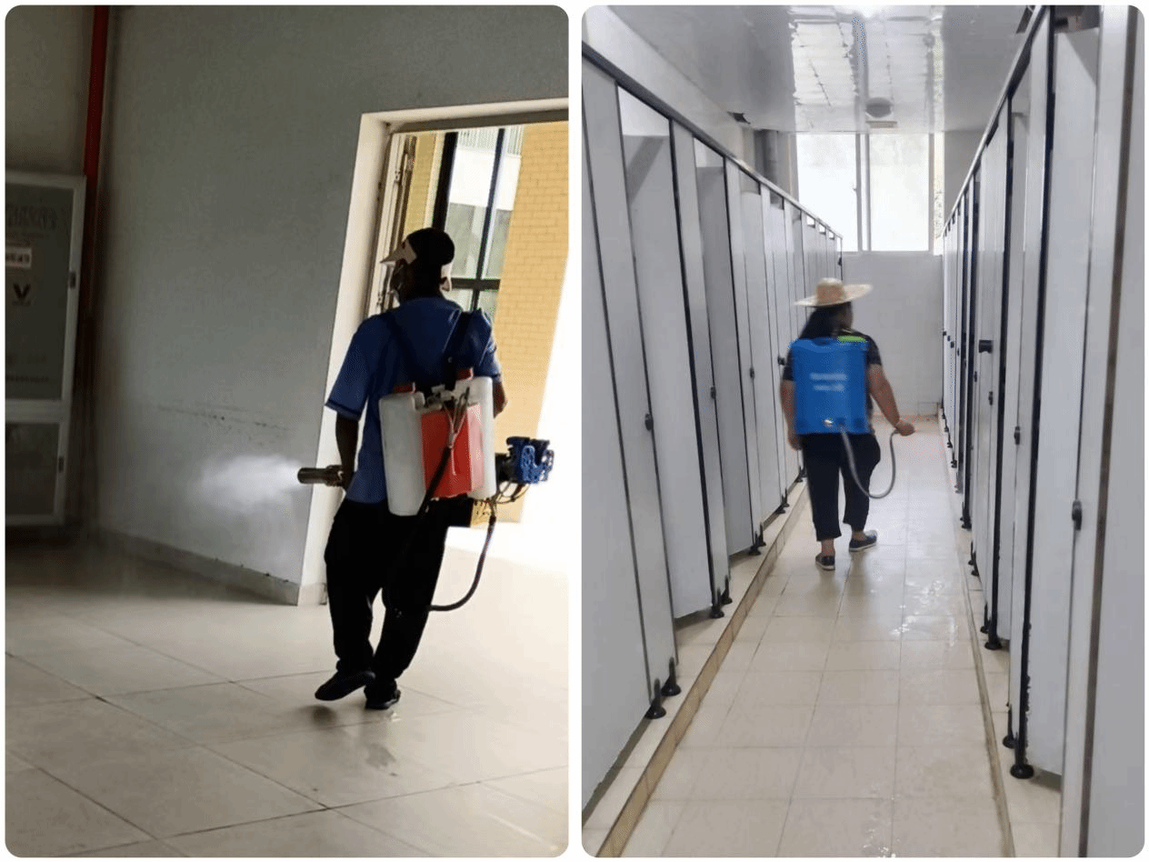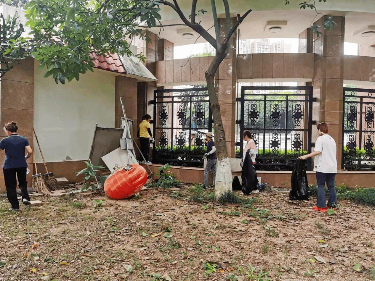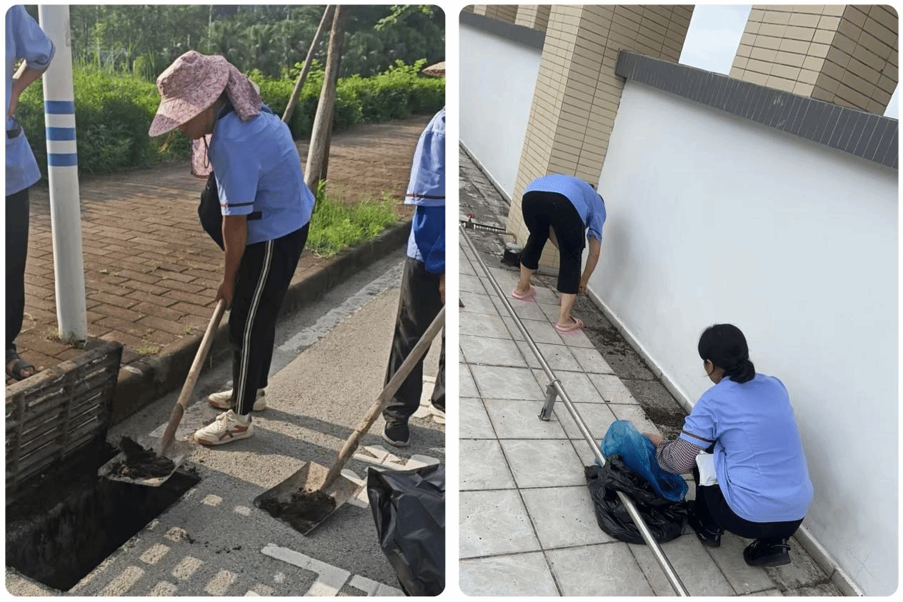 暑假期间降雨频繁,对校园进行彻底清扫,清除公共区域各类积水。定期对校园内的教学、办公楼宇、绿化带等周边的排水沟、花盆托盘、废旧轮胎、垃圾桶旁等易积水区域,翻盆倒罐清积水。
